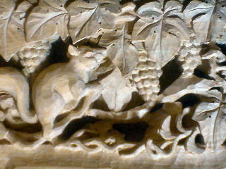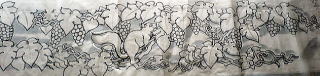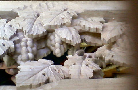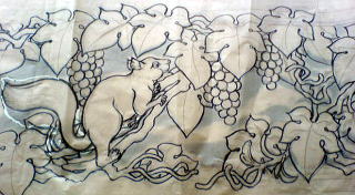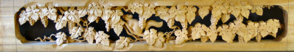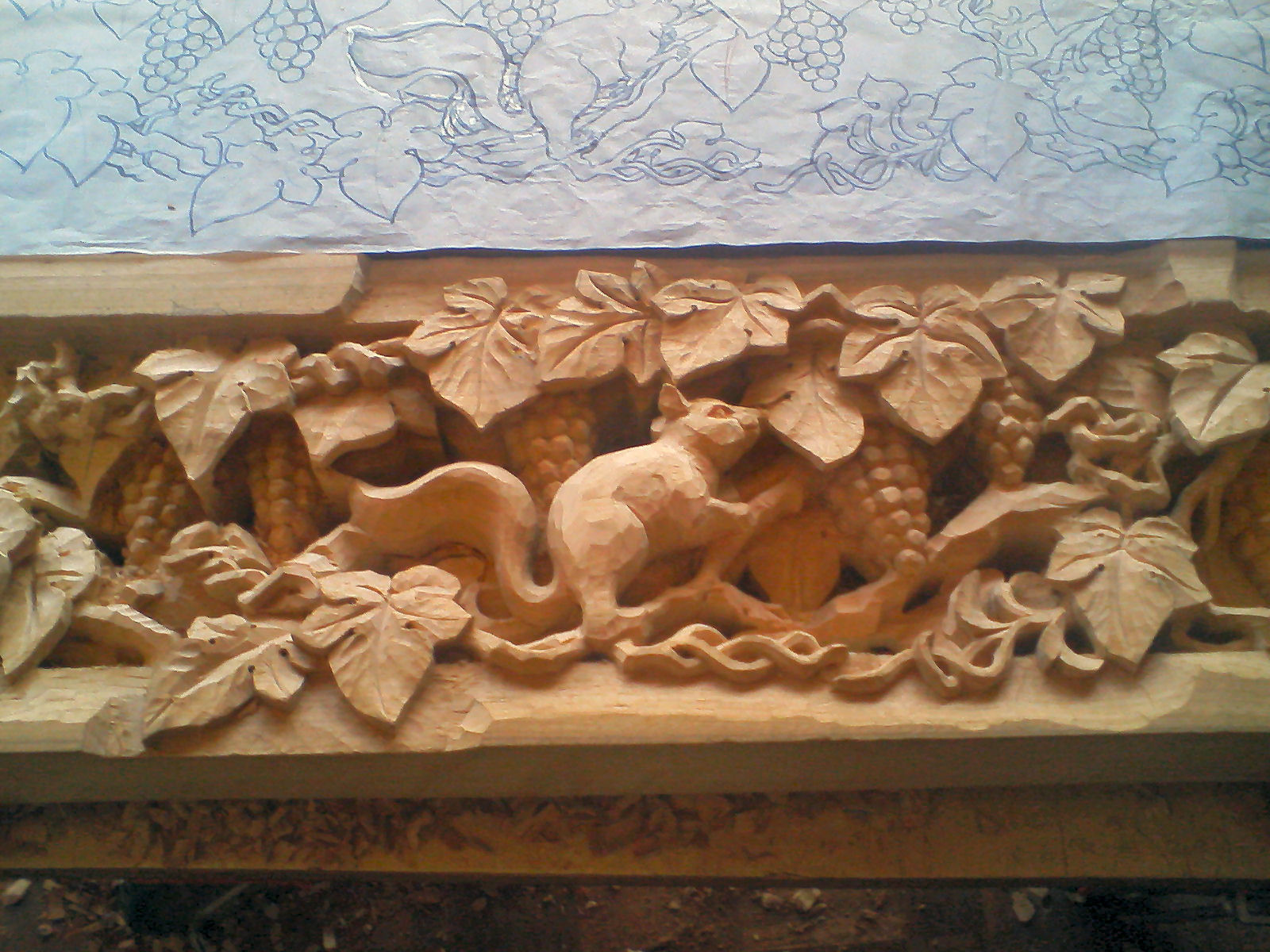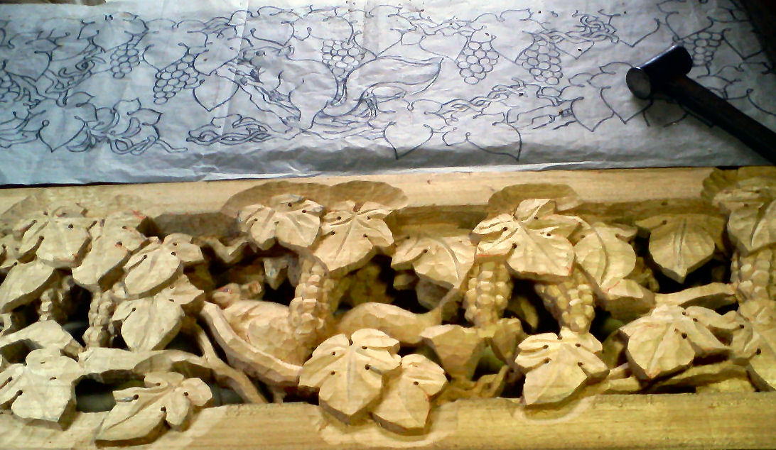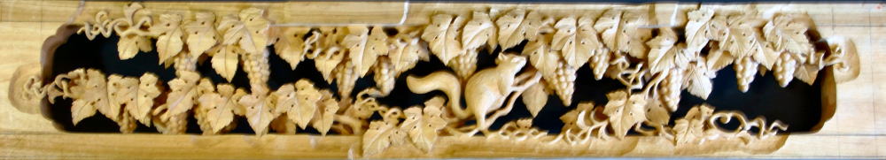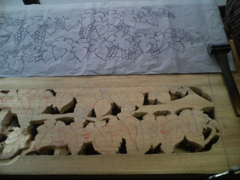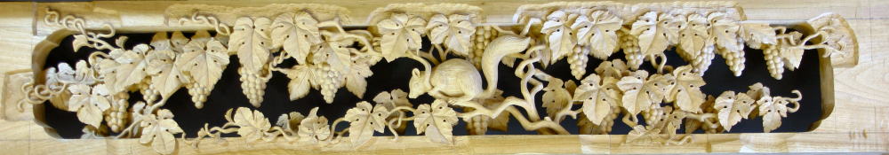 図案を寸法に合わせて描く。これは葡萄にリスです。材質は楠の木です。